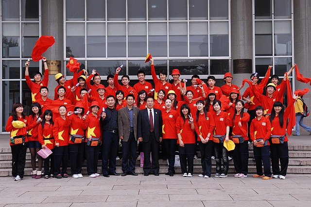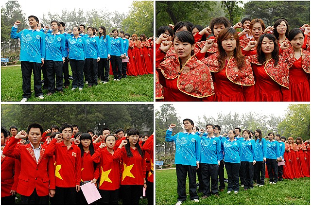 在化工学院2007级学生王振铎带领下,全体参与国庆庆典表演和服务工作的志愿者面对国旗,以青春之名庄严宣誓:“明天在天安门广场,全世界认为我们就是中国青年的形象。我们绝不会辜负父母亲友的期望,我们绝不会辜负师长同学的期望,我们绝不会辜负祖国人民的期望,我们要把最好的形象展示在国庆盛典之上,我们要用加倍的努力让祖国更加繁荣富强,我们必将汇聚青春的点点荧光,铸就成中华明日的一轮朝阳。”
