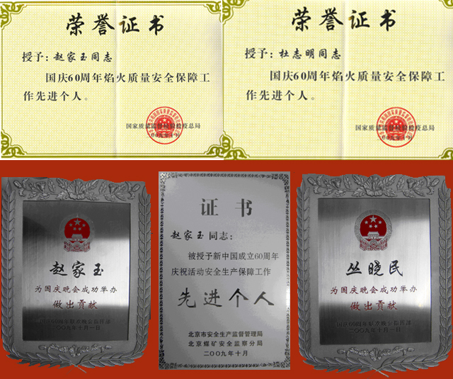 10月30日,国家质量监督检验检疫总局在北京市隆重召开了国庆60周年焰火质量安全保障工作表彰大会。授予了北京理工大学机电学院、爆炸科学与技术国家重点实验室北京市烟花爆竹质量监督检验站国庆60周年焰火质量安全保障工作先进集体荣誉称号。国庆60周年庆典晚会焰火专家赵家玉,国庆60周年安保专家、检验站常务副站长杜志明受到表彰。检验站副站长李增义,工作人员李瑞琴、王炎、任文艳,研究生赵保国、韩俊奇、杨帅、周光巍等被授予先进个人光荣称号。这是检验站继奥运会获得先进集体后又一次获此殊荣,为学校赢得了荣誉,也彰显了我校在烟火技术领域的重要地位。