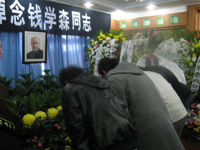 灵堂内摆满了社会各界敬献的花圈和花篮,简单布置的灵堂和洁白的菊花诠释着钱学森先生伟大而简朴的一生。同学们依次向灵堂正中的钱老遗像鞠躬致敬,钱老虽然离我们而去,但他崇高的精神与我们同在,他为中华民族做出的丰功伟绩永远牢记在我们心中。