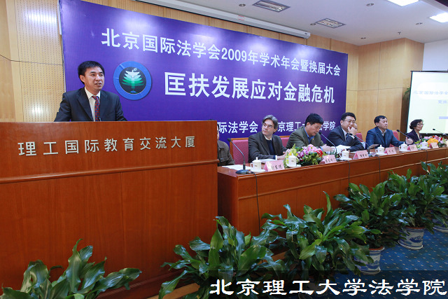 11月7日上午,北京国际法学2009年学术年会暨匡扶发展应对金融危机学术研讨会开幕式在北京理工大学国际教育交流大厦三楼报告厅隆重召开。这次盛会由北京国际法学会和北京理工大学法学院主办。北京国际法学会会长,北京大学法学院常务副院长李鸣教授,最高人民法院副院长、全国政协常委、北京国际法学会名誉会长万鄂湘教授,北京理工大学党委副书记侯光明教授,北京国际法学会副会长、中国政法大学国际法学院粱淑英教授,北京国际法学会秘书长、北京大学法学院院长助理刘东进副教授,北京市法学会副会长杜石平先生,国际红十字委员会东亚地区代表处副代表安东咔门先生,商务部副巡视员杨国华博士及来自北京大学,中国人民大学,中国政法大学,北京理工大学,北京外国语大学,国际关系学院,法学研究所,中央军委,海军等单位的知名学者和专家以及台湾学者130多人参加本次盛会。我校党委副书记侯光明教授代表北京理工大学向大会及各位代表致欢迎词,会议由北京理工大学法学院副院长李寿平教授主持。