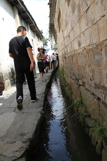 湖光山色与层楼叠院和谐共处,自然景观与人文内涵交相辉映,是宏村区别于其他民居建筑布局的特色,成为当今世界历史文化遗产一大奇迹。队员们在宏村水系的不同位置进行了水样采集,并收集了宏村水系的基本建设资料,在交流中,深深佩服古代先贤们所设计的水系工程,不仅实现了家家户户活水“缠绕”,而且直到今天仍然运转正常,并能根据水势进行调节,具备防洪排涝功能。