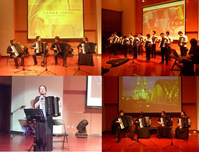 11月27日,“放飞梦想”手风琴专场音乐会在良乡校区演艺厅精彩上演。我校大学生艺术团手风琴团的演员们为大家带来了《马刀舞曲》、《闲聊波尔卡》、《查尔达什舞曲》等脍炙人口的经典曲目。演出中还设计了“走进手风琴”艺术讲解、流行金曲串烧、吉他伴唱等环节。在近两个小时的音乐会之中,观众们欣赏到了《乌克兰民歌主题与变奏》、《桑巴嘉年华》等颇具手风琴特色的经典曲目,还有充满活力的双排键独奏《ELAN》。来自通识选修课风琴入门班的30位同学,也为大家展示了他们在短短11周内刻苦学习努力排练的成果,赢得了观众们的热烈掌声。