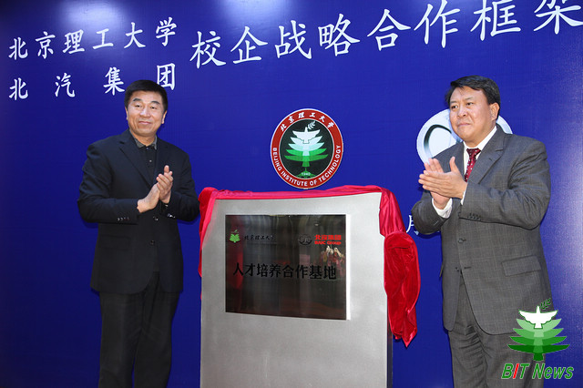 郭大成书记、徐和谊董事长共同为北京理工大学-北京汽车集团有限公司校企合作牌匾揭牌。