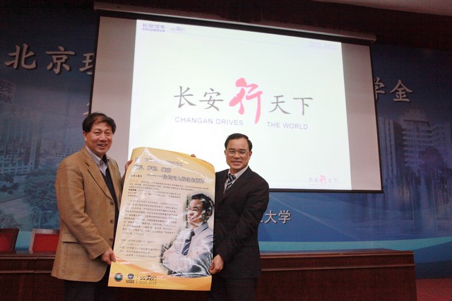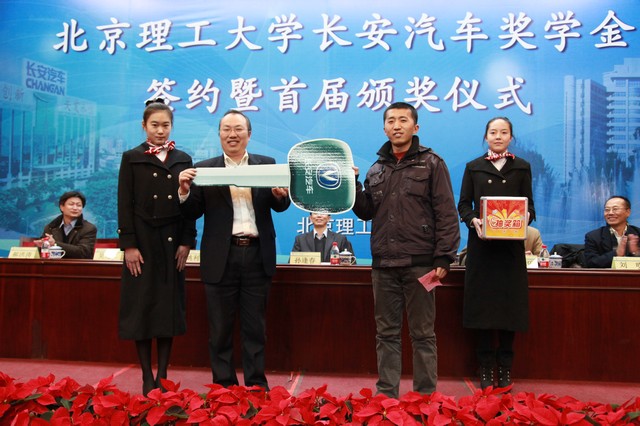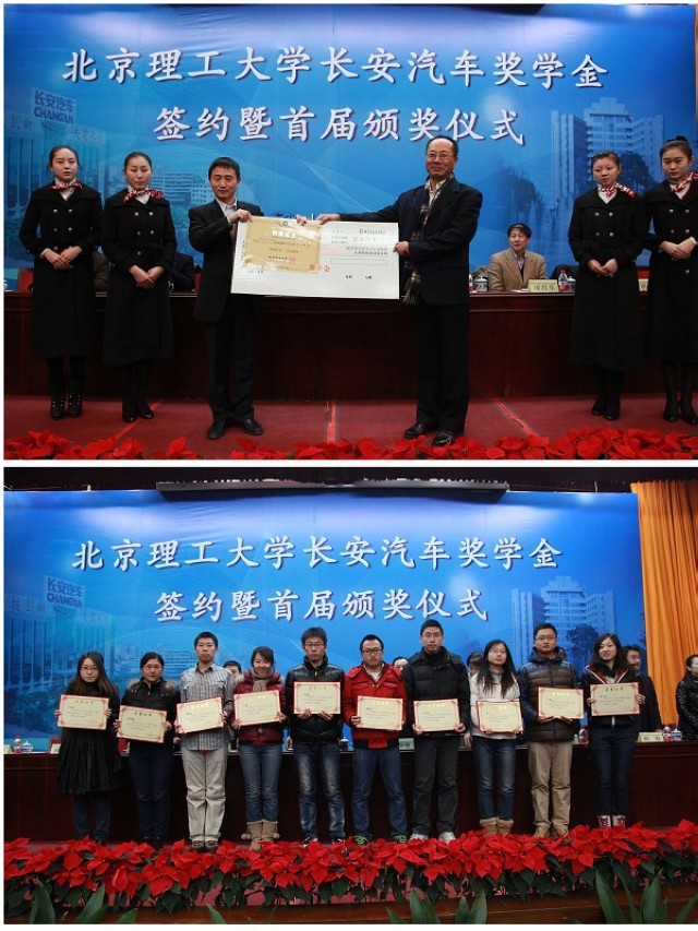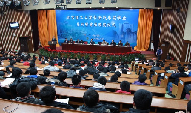 2012年12月26日下午,北京理工大学长安汽车奖学金签约暨首届颁奖仪式在中关村校区中心教学楼报告厅顺利举行。长安汽车党委书记、副总裁朱华荣,长安汽车工程研究总院副院长兼北京院书记吴礼军,长安汽车工程研究总院副院长刘明,北京理工大学副校长孙逢春,北京理工大学校长助理、良乡校区管委会主任姚利民,北京理工大学党委研究生工作部部长郝洪涛,北京理工大学党委学生工作部部长杨海,北京理工大学校团委副书记方蕾,北京理工大学机械与车辆学院院长项昌乐出席了此次活动,仪式由机械与车辆学院副书记副院长范文辉主持。