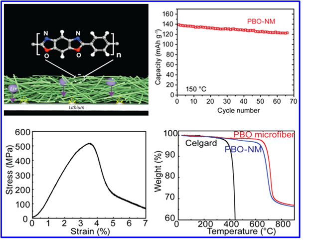 编辑:化工学院 杨鹏 阅读次数: 动力电池的安全性是电动汽车产业发展亟待解决的首要问题,其中,电池内部短路是现有锂离子电池安全性的最大隐患。北京理工大学孙克宁教授团队的郝晓明博士、王振华副教授与美国西北大学合作,针对现有电池隔膜在高温下稳定性不佳,容易收缩导致电池内部短路的实际问题,设计开发了一种全新的PBO基高强度、耐高温隔膜。PBO全称是聚对苯撑苯并二噁唑纤维(Poly-p-phenylene benzobisoxazole),被誉为21世纪超级纤维,具有十分优异的物理机械性能和化学性能,其强度、模量为Kevlar(凯芙拉)纤维的2倍并兼有间位芳纶耐热阻燃的性能,而且物理化学性能完全超过迄今在高性能纤维领域处于领先地位的Kevlar纤维。以PBO为基材的新体系隔膜其拉伸强度能够达到525Mpa,杨氏模量达到20GPa,耐热温度最高可达600℃。通过工艺改变,可以使薄膜的孔径范围在数um到10nm之间可调,当孔径在10nm左右时,该薄膜能够有效阻止锂枝晶生长,降低枝晶刺穿隔膜的风险,进一步提高锂电池的安全性。