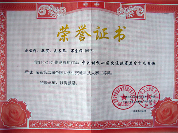 由于高利教授的悉心指导及参赛小组成员的刻苦钻研,使北京理工大学代表队获得了三等奖的好成绩,这是我校交通工程系本科生第一次在全国性的大赛中获奖。