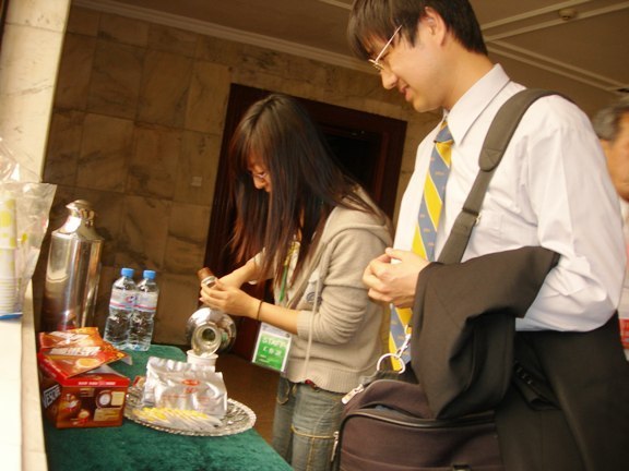 报告会每天有三个会场同时进行,每个会场安排3-4名志愿者为参会人员提供服务。会场组负责全部会议会场的安排和布置,以及全部会议用设备的调试工作。会场组的工作每天都面临新的挑战,随时都有新的问题摆在面前。他们积极与会议中心有关人员协调,随时处理各种问题;为代表提供更为全面的现场服务,如设备调试、为发言者提供话筒等,而且要求会议结束前要一直坚守会场,保证会议的顺利进行。他们每个人都坚守岗位,很好地完成了自己的工作。会场服务的另一个主要任务是布置茶歇,他们要将水果、点心、茶、咖啡、开水等提前布置好,为参会人员提供热情周到的服务,包括提供咨询、泡茶、冲咖啡等。虽然工作量不大,但他们要一直坚守岗位,一天会议下来也非常辛苦。