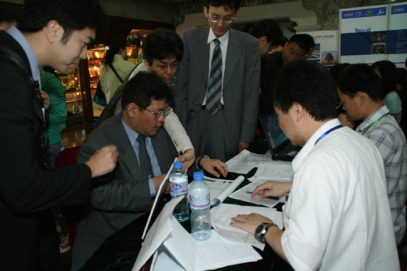 外宾代表人数虽不及中宾代表的人数多,但工作的繁琐性有过之而无不及。外宾注册的大量工作在会议开始前一天就已展开。从22日一大早,外宾注册组的志愿服务人员就开始处理大量的代表信息,包括确认注册信息、发放资料、安排食宿等。白天在紧张的接待工作中度过,每天的归档和信息录入工作则在晚上进行。而且还有一些参会者是晚上10点多的航班抵京,5月22、23日他们的工作坚持到了深夜12点。尽管繁重的工作使人疲惫,但每天早晨全体人员仍然以璀璨的笑脸迎接前来注册的每一位宾客。在与咨询导引组的默契配合下,每一位注册完的外宾,均由专人陪送到客房。会议结束,国际注册组的志愿者还要负责办理外宾退房手续。
