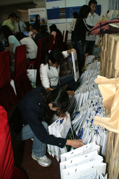 代表从现场注册,从制作胸卡、住宿、购买餐票、申请调换住宿、发放资料、开具发票等等一切内容都需在注册台上一气呵成。同时,后台要及时更新完成全部数据的录入,随时提供注册信息的查询。国内注册台在某些情况下还成了信息咨询台,不仅为中宾提供了大量的服务,而且对于外宾的咨询,他们也有问必答,甚至有一位外宾还将私人物品放心地存放在他们那里,约好时间再来取,他们这里俨然成为了物品寄存处。