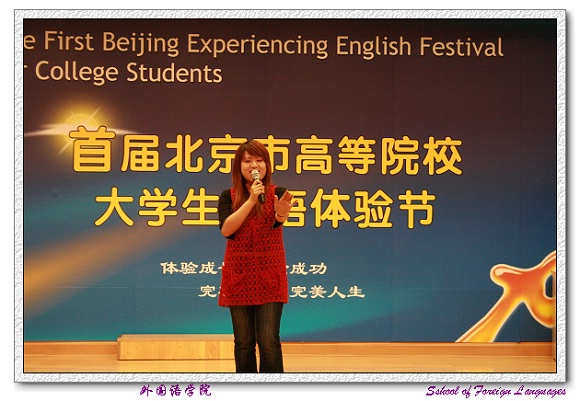 北京市高等院校大学生体验节是由高等教育出版(集团)、外语教学研究与发展中心主办的一次北京高校外国语学院交流合作的一次盛会。来自北京理工大学、中国传媒大学、北京科技大学等8所北京高校参加了此次体验节。北京理工大学外国语学院选派了04级李旻佳同学参加此次体验节英文歌曲演唱比赛。李旻佳同学以一首《Eyes on me》获得全场观众的掌声,最终获得演唱优秀奖。外国语学院张磊老师获得“优秀辅导教师奖”。