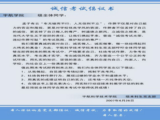 在临近考试的周末里,宇航学院各班班主任带领同学们总结了班级一年来的学习工作,重申了学校学籍管理的相关条例,列举了考试作弊的反面案例,向同学们提出了“诚信考试”倡议,最后同学们集体在《诚信考试倡议书》上签字表决心。