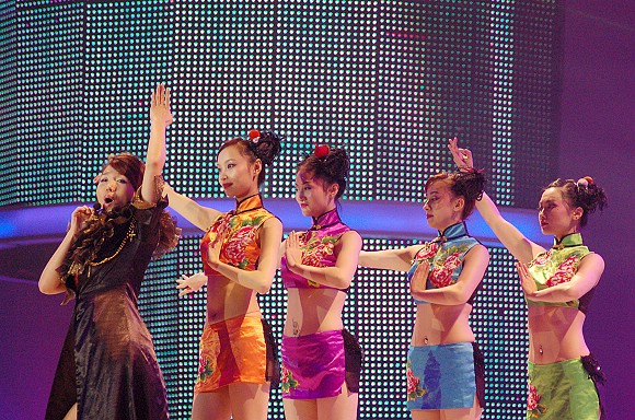 要说到将音乐和体育完美结合,就一定要数台湾小天后蔡依林的最新单曲《舞娘》。继MTV亚洲大奖上首次公开“舞娘”功力,“志愿北京”演唱会是蔡依林首次在国内的舞台上表演。彩带上下纷飞,舞球左右滚动,这段高难度的融合艺术体操元素的舞蹈,将体育的力量与舞蹈的柔美完美结合,尽显新晋亚洲小天后的风采。