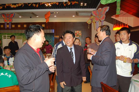 匡镜明校长在举杯预祝北京理工大学清研利华足球队旗开得胜、马到成功!