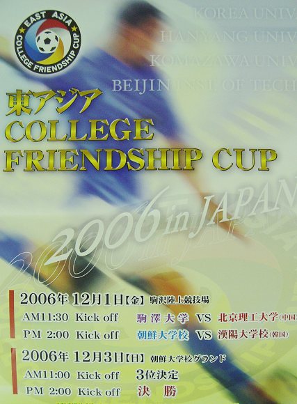 北京理工大学足球队于11月29日启程并顺利抵达日本东京奥林匹克青少年活动中心,在即将开始的三国四队的东亚大学生足球邀请赛中,12月1日将与日本的驹泽大学队首先交手(由驹泽大学队主力队员组成的日本大学生足球队曾连续获得2003年和2005年两届世界大运会足球比赛的冠军,在2003年韩国世界大运会足球项目的八进四比赛中,由我校足球队组成的中国大学生足球队与其战成平局,最后在点球大战中惜败,尔后取得了第七名的成绩),获胜的球队将在12月3日与朝鲜大学队和汉阳大学队之间的胜者争夺冠军,而首战落败的球队将只能在同一天争夺第三名。由于我校足球队是以四届全国大学生足球联赛冠军和刚刚冲入中国足协甲级联赛的惟一一支“学生军”的身份应邀参加此项国际大学生足球赛事,在国家队、国奥队、国青队、国少队一路走低的情况下,这项代表着东亚大学生足球最高水平的赛事也引起了足球界及各大媒体的广泛关注。