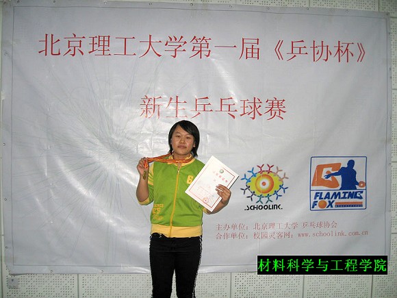 材料科学与工程学院04310601班王美娜同学勇夺北京理工大学第一届新生乒乓球赛冠军