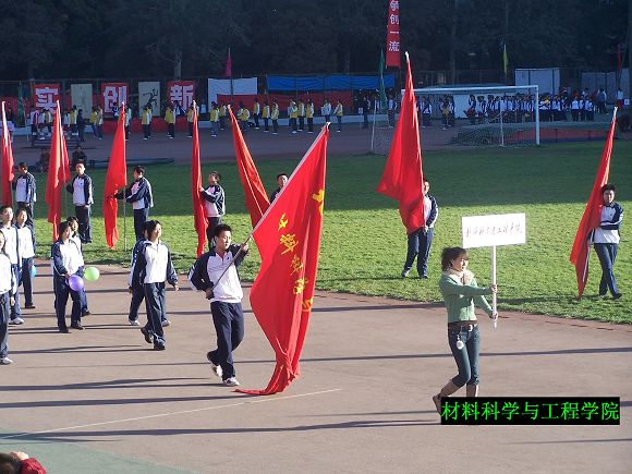 入场式上我院打出了“发扬奥运精神,展我材院风采“的标语表达志愿奥运的信心