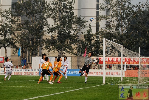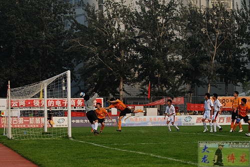 下半场一上来双方在中场展开了短兵相接,争抢非常积极。爱国者队28号袁涛带球突入前场,左右晃动,横向带球射门,球再次擦着远门柱偏出。