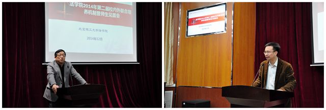 2014年12月23日下午14:00,北京理工大学法学院第二届法律硕士研究生校内外联合培养机制研讨暨师生见面会在七号教学楼模拟法庭如期举行。北京理工大学党委副书记、副校长李和章、法学院院长曲三强、党委书记杨海、副院长李寿平、副院长张艳丽及法学院法律硕士研究生校内外研究生导师和2014级全体法律硕士研究生出席了本次会议。