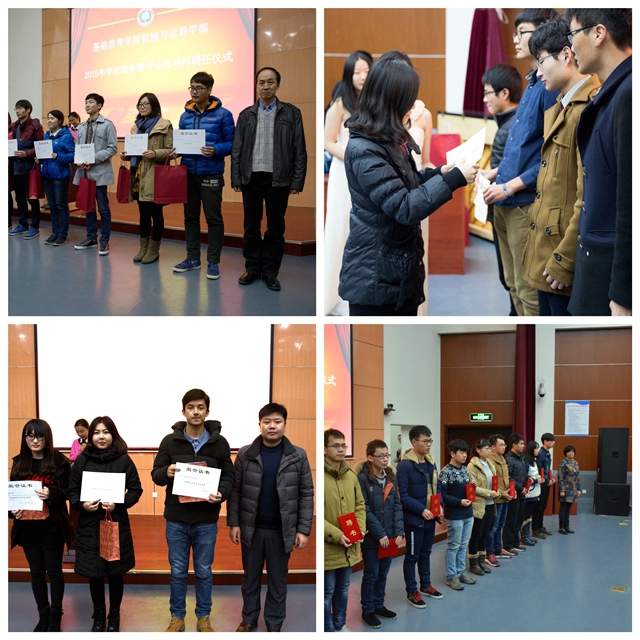 为进一步树立优秀典型、建设良好学风,倡导榜样带动、共同进步的集体学习精神,努力营造促进学生全面发展的良好氛围,12月2日,基础教育学院机械与运载学部在良乡校区综合楼报告厅举行2015年学部表彰暨学业指导师聘任仪式。基础教育学院常务副院长张青山、基础教育学院副院长程杞元、基础教育学院副书记副院长肖坤、校团委副书记兼基础教育学院团委书记陆宝萍、机电学院团委书记章涛、机械学院团委书记郝佳馨及2014级班主任代表出席了大会。2014级获奖学生代表和2015级全体班团干部参加了大会。