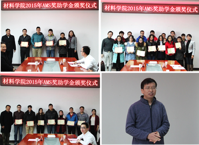 首先,颁发的材料学院2015年度AMS奖助学金,佛山先进机械设备有限公司(AMS)作为国内从事表面工程技术的知名企业,事业蓬勃发展的同时不忘心系教育事业,从2005年起连续十一年在材料学院设立奖学金,也是为材料学院捐赠历史最长的企业,每年捐赠五万元,累计捐赠五十五万元,300余名学生得到奖励和资助。
