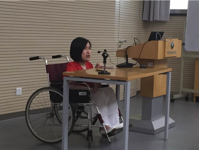 听她讲到自己的人生经历,讲着她在从医过程中遇到的各种病人的故事,不禁让我们感叹生命的伟大与可贵。在演讲期间柴丽丽女士几次哽咽,让我们敬佩她的坚强,这不仅仅是一个残疾人励志的故事,更是提示我们,作为身体健康青年人,我们应该做出哪些改变呢?我们有着充足的资源,有着优越的生活条件,可是我们却将生命浪费在打游戏,追剧的时间里,还总是抱怨人生的不公平。可是我们不知道,有多少像柴丽丽女士一样的人,虽然她的生命从一开始就是不公平的,但是她却用自己的力量去开辟了一条全新的道路去帮助像她一样的渐冻人。生活以痛吻你,你却报之以歌!谢谢柴丽丽女士的分享。