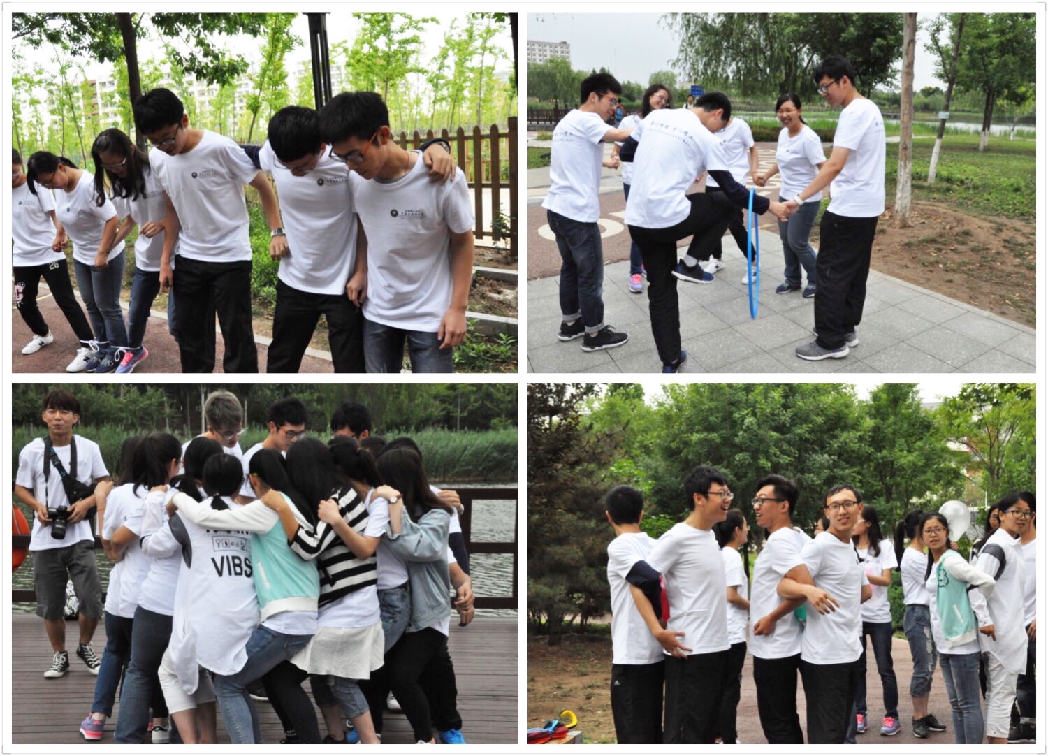 在素质拓展活动中,安排了 “万里长城”、“两人三足”、“心心相印”、“反向执行”、“生命线”等五个项目。“万里长城”要求每队侧身围成一个圈,每名队员坐在后一位的腿上,每一队都坐稳并坚持了很久,稳固的不仅是这一座“万里长城”,更是同学之间的信任。“两人三足”要求同学们按组排成四列,每一名组员的脚都与相邻组员的脚绑在一起,虽然行动不便,但同学们们通过组内的配合协调,一步一步的向终点走去。当进行到后三个环节时,学员之间的配合也更默契了,每位学员在活动中不仅充满了热情和斗志,也在合作中保持着耐心。素拓给学员们带来的不仅是团队合作能力上的提高,更带给他们一份珍贵的友谊,各小组成员在一个个游戏项目中从陌生变的熟悉,逐渐缩短了彼此之间的距离,变得默契十足,同时也展现了他们的团队协作精神和独特的个人魅力。