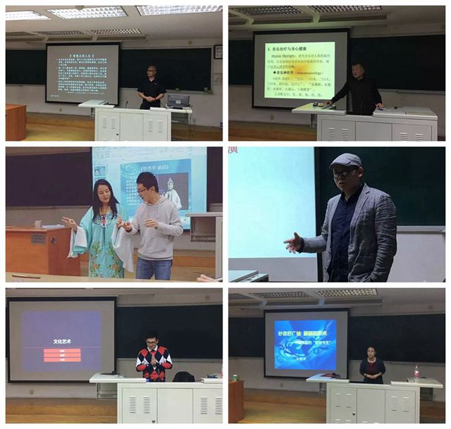 除此之外,根据十八大提出的传承优秀传统文化精神,本学期还特别开设了四场“传承经典系列”讲座,分别是:由民族音乐教育家、中国音乐学院教授赵承伟老师主讲的《余音绕梁——中国传统音乐素描》;昆曲名家、中国艺术研究院研究员刘静老师主讲的《春色如许——昆曲艺术》;北京师范大学艺术与传媒学院副教授、硕士生导师王鹏老师主讲的《流风回雪 倒峡逆波——传统工笔人物画对比表现手法》;由艺术学理论出站博士后、北京师范大学王阳文老师主讲的《妙音舒广袖 翩翩踏歌来——中国舞蹈的前世今生》。一周一讲,精彩纷呈,同学们跟随主讲嘉宾生动的讲解,徜徉在艺术文化的海洋里,仿佛经历了一次次精神上的旅行,大家纷纷表示通过聆听讲座,拓宽了思考的维度,提高了综合素养,也增添了一段最为美好的回忆。