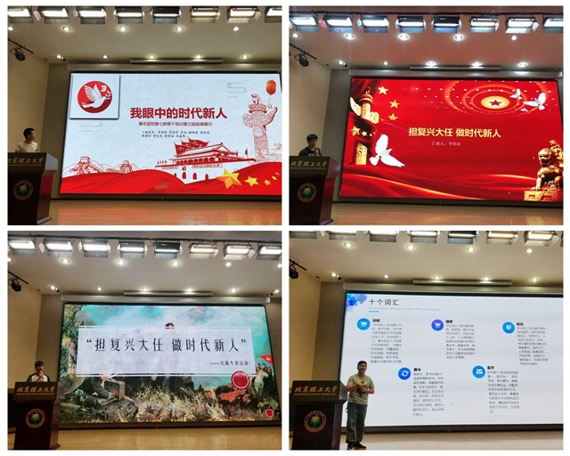 典礼在《中国共青团团歌》中开始。来自材料学院青年团校第七期骨干培训班的9个团队就“担复兴大任,做时代新人”主题进行了社会实践汇报。各小组分别赴北京理工大学校史馆、中国人民革命军事博物馆、中国人民抗日战争纪念馆等地进行实践参观,并总结了实践感悟。此外,各小组分别讨论总结了“时代新人”的一个标准、一个故事、一段“新人语录”和十大高频词汇等相关内容,对“时代新人”做出了自己的理解。