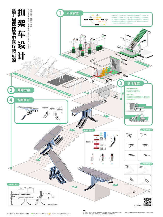 设计说明:基于居民住宅中医疗转运的担架车设计以居民住宅环境下的医疗急救所面临的问题和需求作为研究点 ,通过对医疗救护服务、担架车现状以及建筑空间 限定进行分析,总结出使用者对担架车的设计需求 以及担架车本身受到环境、操作者的诸多限制因素 ,并以此为基础进行担架车的设计和创新。设计点主要有:1.对担架越障原理的创新,担架车越障结构将履带式结构和步进式结构相结合,使担架车能够满足居民住宅中多种环境条件的通行使用。2.对担架车的支撑结构进行创新,设计了更加灵活的连接方式,为担架车的功能实现提供更多可能性。3.结合新的结构和外观造型,对担架车的色彩使用进行创新,使用刺激性较弱的色彩为患者提供安全舒适的护理感受,提升对产品的信任感。