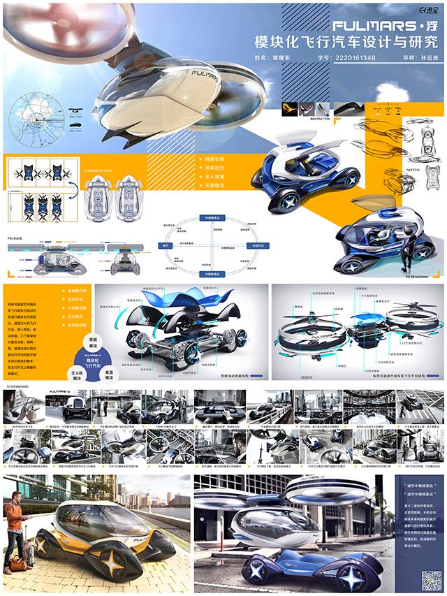 设计说明:基于未来城市交通构建三维网络,将共享汽车的自主性连接性植入到空中交通系统中,和传统的地面二维交通交织呼应,为城市中短途通勤提供新的解决方案。创新性地提出,“城市中继换乘站”和“城市中继换乘点”概念。共轴反旋涵道螺旋桨飞行器载荷平台和智能电动底盘模块搭载中间独立舱体,三大模块两大部分可应对城市陆空各种状况。通过后台大数据智能调控,根据不同路况不同区域匹配对应空中飞行模块或地面汽车模块切换,使乘客无缝对接换乘模块,确保在拥堵路段前实现模式切换顺畅通过。双人纵置布局,无人驾驶通过性更强。根据涵道飞行器的技术优势使得飞行汽车能随时起降,且接触安全性提升,不同数量涵道组合能提供更多载荷搭配可能,使涵道平台和飞行汽车的用途更加广泛。