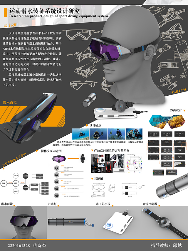 设计说明:该设计考虑到潜水者在水下对于数据的依赖性以及使用现有潜水电脑表时的弊端,创新性的将潜水电脑表和潜水面镜进行融合,基于AR技术将数据显示以及摄像头集合到潜水面镜中,使得用户能够更加方便的查看数据,并且加强其可玩性以及与潜伴的互动性。此外,针对潜伴之间的交流,对现有的潜水装备进行了改进和功能性整合。
