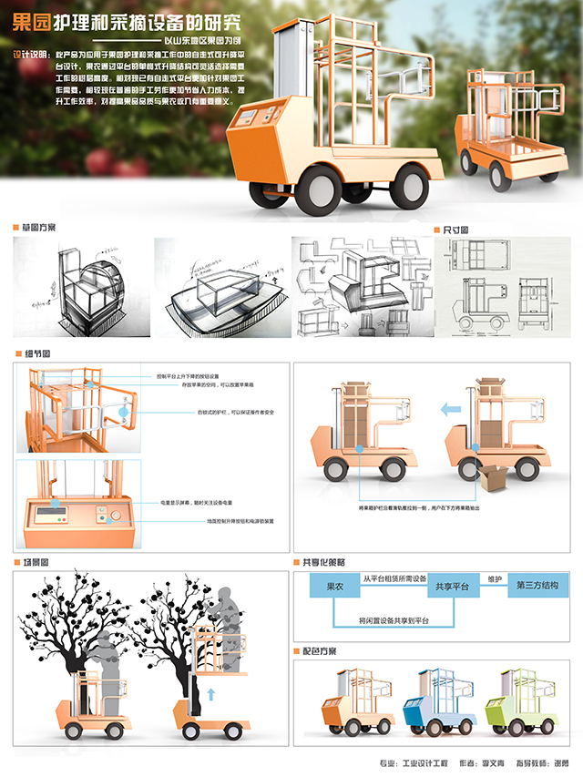 设计说明:本产品为以储蓄电池作为动力源,在液压驱动的轮式底盘上搭载的桅杆式装置的升降平台。通过整机结构的合理布置,使得整个作业平台体积保持在合理范围内,使其更容易在植株之间进行作业;具体考虑果农工作时的工作状态,分析采摘时的工作方式,避免工作过程中的大幅度动作,减轻作业人员的疲劳;对于提升果农经济效益,降低劳动强度,推动果园机械化的发展具有一定意义。