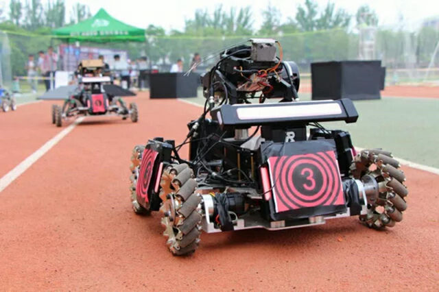 夜幕降临,一辆辆战车在场内走位、射击,机器人身上的“血量”显示板和发射的红绿光线在晚上显得清晰异常,围场内机器人大战硝烟...