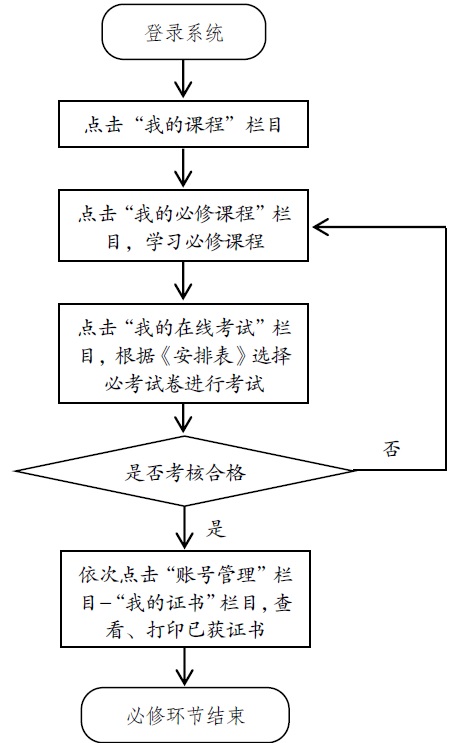 必修环节的操作流程见图2。学员打开资产与实验室管理处网站(http://www.bit.edu.cn/gbxxgk/gbgljg/sysysbglc/index.htm),点击“资产与实验室管理处网站”,进入学校“统一身份认证登录”页面,按页面右侧提示输入用户名和密码进入“资产与实验室综合管理平台”,点击“实验室安全教育与考试系统”进行操作。建议使用IE浏览器,需要启用activex插件,且不要阻止弹出窗口。