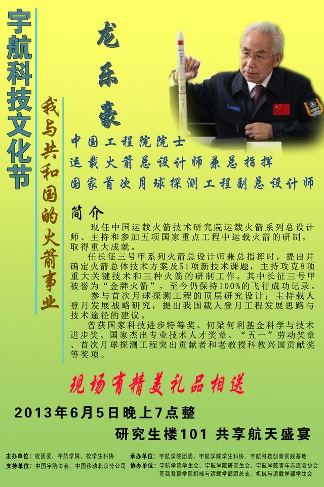 宇航科技文化节讲座通知——龙乐豪院士《我与共和国的火箭事业》