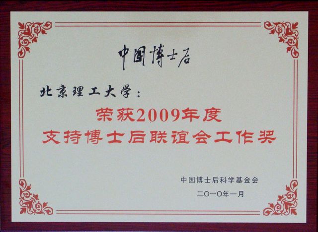 2010年1月8日,2010年北京博士后迎春晚会在友谊宾馆贵宾楼多功能厅举行,会上对部分博士后设站单位进行了表彰。我校积极参与和支持博士后联谊会的工作,荣获由中国博士后科学基金会颁发的“2009年度支持博士后联谊会工作奖”。