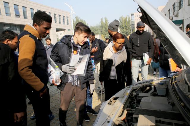 开幕式结束后,同学们来到了具有特色的北理工新能源汽车租赁站,同新能源电动汽车进行零距离接触。在两名来自机械学院的留学生志愿者详细讲解下,同学们对新型能源电动车的各个系统参数、运行模式及发动机引擎设计等关键技术有了较为深入地了解,并在专业司机的安排下纷纷进行了试乘体验,兴奋之情溢于言表。