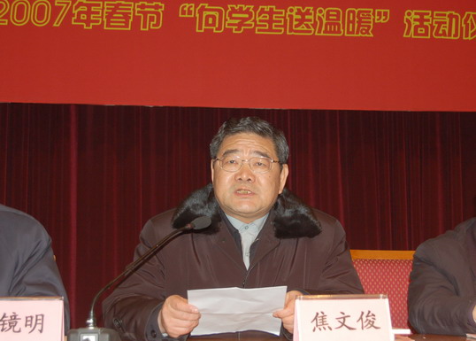 随后,校党委书记焦文俊发表了热情洋溢的讲话。他首先代表学校党委和行政向与会同学及其家人致以新春诚挚的祝福,他指出:“学生资助工作是解决学生最关心、最直接、最现实利益问题的主要渠道,是构建社会主义和谐校园的重要工作之一。长期以来,北京理工大学坚持在实施大学生思想政治教育中注重关心人、帮助人,一直把学生资助工作作为关心学生、实施德育的重要内容常抓不懈。针对存在经济困难学生这个特殊群体的状况,坚持以学生为本,为学生办实事办好事,采取一系列帮困助困措施,不断改进和创新工作方式和方法,不断完善资助体系的建设,努力解决大学生的实际困难,帮助贫困大学生完成学业,努力把党和政府对大学生的关怀落到实处。学校对于家庭经济困难学生的成长成才寄予了更多的关注和希望,学校中也有许多自强不息的优秀学生以新一代青年特有的方式诠释着延安精神的时代新意,传承着延安精神的思想精髓。他勉励所有家庭经济困难学生能以传承延安精神为己任,以更加乐观、昂扬的精神面貌来面对暂时的困难,并能用自己自强不息的精神带动其他同学共同进步,为构建社会主义和谐校园尽自己的一份力量。”