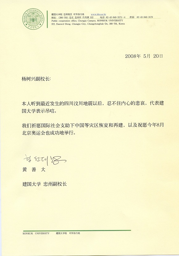 汶川大地震发生后,我校先后收到了多所国外和港澳台合作院校的慰问函电。韩国东西大学校长朴东顺致信胡海岩校长,对我校是否受到地震影响表示关切,相信中华民族定会战胜困难,取得更大的发展。韩国建国大学忠州副校长黄善大致信杨树兴副校长,表达了对灾区重建和奥运会成功举行的良好的祝愿。