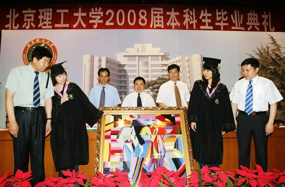 设计艺术学院的毕业生代表向母校赠送纪念品——一幅主题为《华彩青春》的挂毯。这是由9名设计艺术学院的毕业生历时1个月,采用传统工艺手法共同自发编制而成,挂毯中用斑斓的五彩丝线,勾织出3名清亮的少女和缤纷的梦想世界,一针一线,一缕一行,经纬交错,惺惺相惜,表述了母校给予四年大学生活多姿多彩的记忆、丰富的内涵和灿烂的未来,表达了对母校的感激、对老师的感恩和对未来的憧憬。郭大成书记、胡海岩校长代表学校接受挂毯并与毕业生代表合影留念。