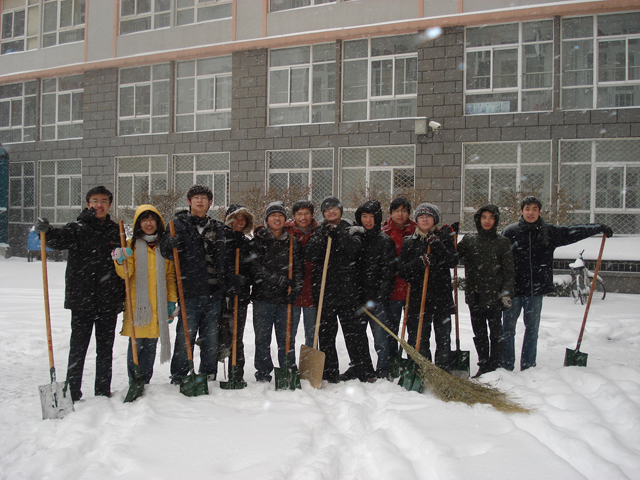 2010年1月3日,33年难遇的特大降雪降临北京市。几小时之后,雪积校园,妨碍了车辆、行人的正常活动,严重影响了师生出行.为防止大雪越积越厚,方便全校师生出行,我校延河之星志愿者总队充分发挥志愿服务精神,于1月3日和1月5日分别组织了两次学生志愿者义务清扫积雪活动。