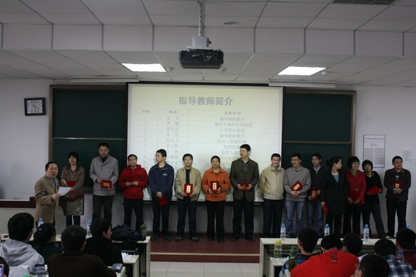 首先,杨刚老师向同学们介绍了我校2010年全国大学生数学建模竞赛15位指导教师的专业方向,希望同学们能够在参与数学建模的活动中培养数学兴趣,增强实践应用能力。随后,在热烈的掌声中,杨刚老师为指导教师颁发数学模协会指导教师聘任证书。