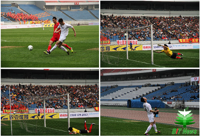 主场作战的重足昨天比赛一开始,还是显得很主动的,只可惜小马丁第12分钟的倒钩射门被立柱挡出,重足错过了本场比赛最佳进球机会。相对而言,场面上看似被动挨打的北理工却能抓住为数不多的反击机会。第22分钟,韩光徽左路突破射门,重足门将国威准备不足,足球从近角入网,北理工1比0领先结束上半场。