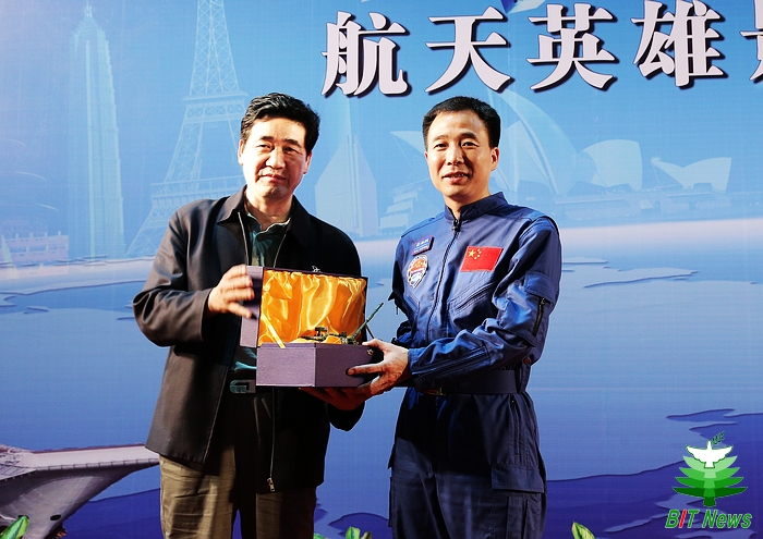 最后,景海鹏再次郑重表达了对祖国、人民和家人最深挚的感激,并献上了自己对祖国、对学校、对同学的真诚祝福。赵显利副校长代表北京理工大学赠予景海鹏纪念品,报告会在热烈的气氛中圆满结束。会后,参与互动的同学们还得到了景海鹏精心准备的签名照作为礼物,部分同学还与景海鹏合影留念。