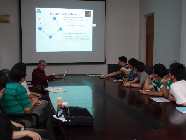 这次学术报告会Soura Dasgupta教授用精彩的图片和翔实的数据,从刚性图论的角度深入浅出的论述多智能体编队系统分析与设计的最新研究进展,详细阐述了多智能体编队系统分析与控制中涉及的刚性拓扑图设计及队形持久性保持的内涵和性质以及在不同队形类型情况下持久性保持控制律的设计细节。报告结束后,参加会议的师生与Soura Dasgupta教授就相关问题进行了充分的交流与讨论。此次报告学术气氛浓厚,讨论问题深入,发言积极踊跃,取得了很好的学术交流和开阔视野的效果。