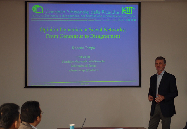 Roberto Tempo教授从社会网络的实际背景出发,给出了一种基于信息交互的社会网络模型,用于模拟多个个体就某一话题进行交流,最终得到各自看法的过程。同时,针对多个有关联话题的交流问题,Roberto Tempo教授给出了自己最新的研究进展,并从理论上证明了相关模型的可行性。会后,Roberto Tempo教授与本校师生进行了热烈的交流与讨论。