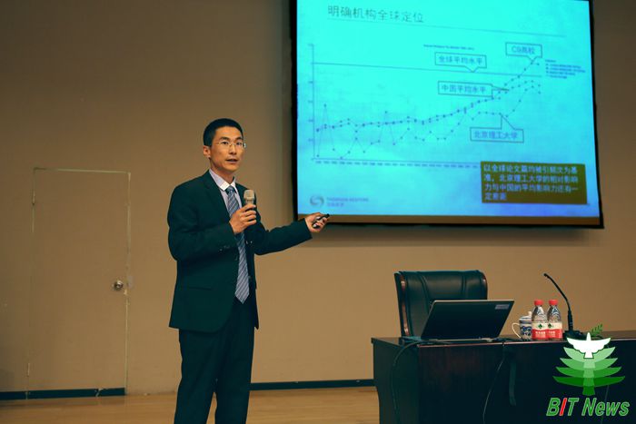 报告会上,王利从以下几个方面展开讲解:一是简要介绍了科研绩效评价和学科分析的权威数据。二是详细阐述了北京理工大学过去10年科技论文的产出情况。从各学科论文产出数量及占机构总体的百分比、国际合作论文占总体论文比例、相对于全球各学科平均影响力、一级学科发展趋势等角度对我校科研论文产出情况进行了分析。三是运用最权威数据将北京理工大学与相关高等院校进行多角度对比分析,详细解读了我校目前具备的优势及存在的差距。