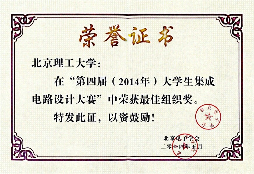 2014年5月31号,在全国范围内举办为期5个月的“第四届(2014年)大学生集成电路设计大赛”在北方工业大学顺利落幕。参赛队伍来自全国各地,清华大学、武汉大学、北京理工大学、南开大学、哈尔滨工业大学等众多名校参与这此次比赛。经过专家公平公正公开的评审,北京理工大学信息与电子学院李通团队荣获特等奖、李安安团队荣获二等奖,桂小琰老师荣获优秀指导老师称号。北京理工大学荣获了“第四届(2014年)大学生集成电路设计大赛”最佳组织奖。