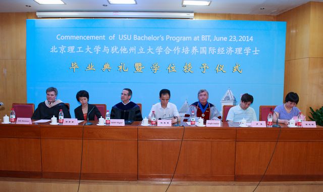 2014年6月23日下午,国际教育学院在北理工国际教育交流中心三层报告厅隆重举行了北京理工大学与美国犹他州立大学合作办学项目第八届学生毕业典礼。出席毕业典礼的有犹他州立大学副教务长Robert W. Wagner教授及其助理John Mortensen先生、亨茨曼商学院国际项目学术主任Dwight Israelsen教授、北京理工大学孙逢春副校长、国际交流合作处邢清清副处长、国际教育学院梅文博院长、罗佳书记、蒋志湘副院长、学院部分教职工、全体毕业生及部分学生家长。梅文博院长主持典礼。