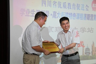 沈翼代表四川省优质教育促进会致辞。他表明举办此次暑期营,旨在鼓励优秀高中学生提前走进大学校园,激发他们对大学专业的思考。营员们通过参加丰富多彩的学习实践活动,最大程度地获得了优势专业课程体验与学科启迪,这是北京理工大学之行最大的收获。他代表四川省优质教育促进会和参加此次暑期营的全体师生对北京理工大学领导、老师、志愿者的热情和包容表示诚挚的感谢。他代表四川省优质教育促进会向北京理工大学授予了“高大衔接教育基地”牌匾。同时,李振键代表北京理工大学向四川省优质教育促进会回赠了学校特色纪念品。为了肯定营员们的顺利结业,李振键向詹友鹏等69名营员颁发了结业证书。营员们在各学院老师和志愿者的指导下分组完成了科技创新作品,并有三组荣获优秀奖,沈翼为其颁发了获奖证书。